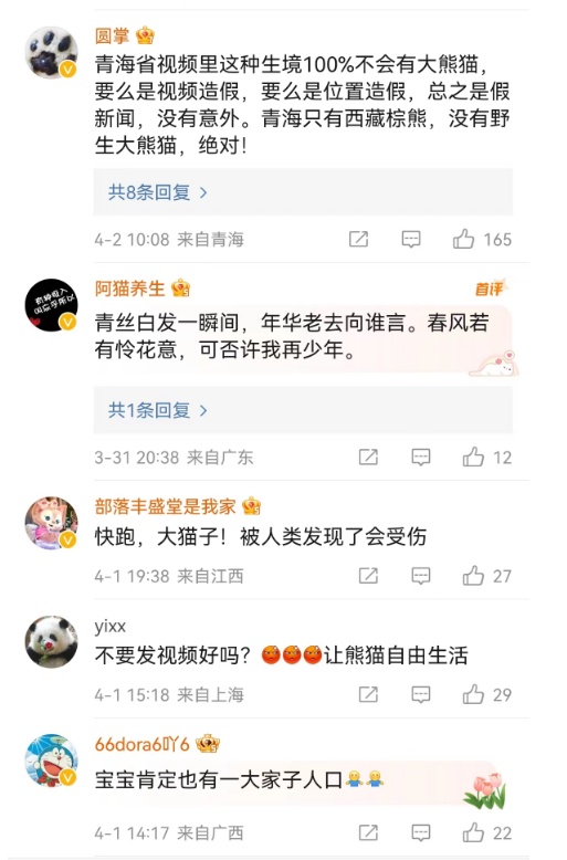 此视频发布后,部分网友对视频中大熊猫的生存状况表示担忧,也有网友对视频内容存在质疑。“视频里这种生境100%不会有大熊猫,要么是视频造假,要么是位置造假,总之是假新闻,没有意外。青海只有西藏棕熊,没有野生大熊猫,绝对!”微博认证为知名科学科普博主的“圆掌”跟帖回复说。