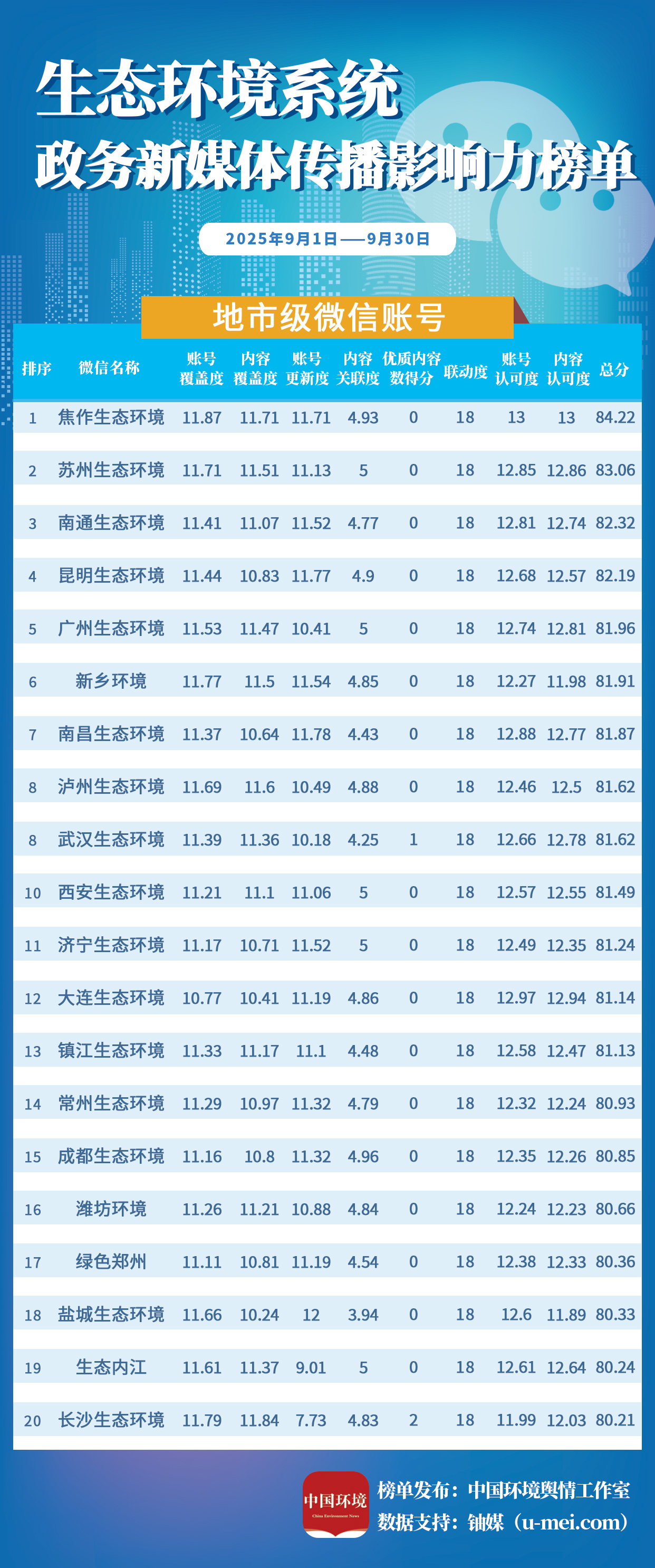 为进一步推动生态环境系统政务新媒体持续健康发展,更好发挥信息公开、舆论引导、社会治理、凝聚共识等作用,中国环境报社、中国环境客户端日前发布9月全国生态环境系统政务新媒体传播影响力榜单。