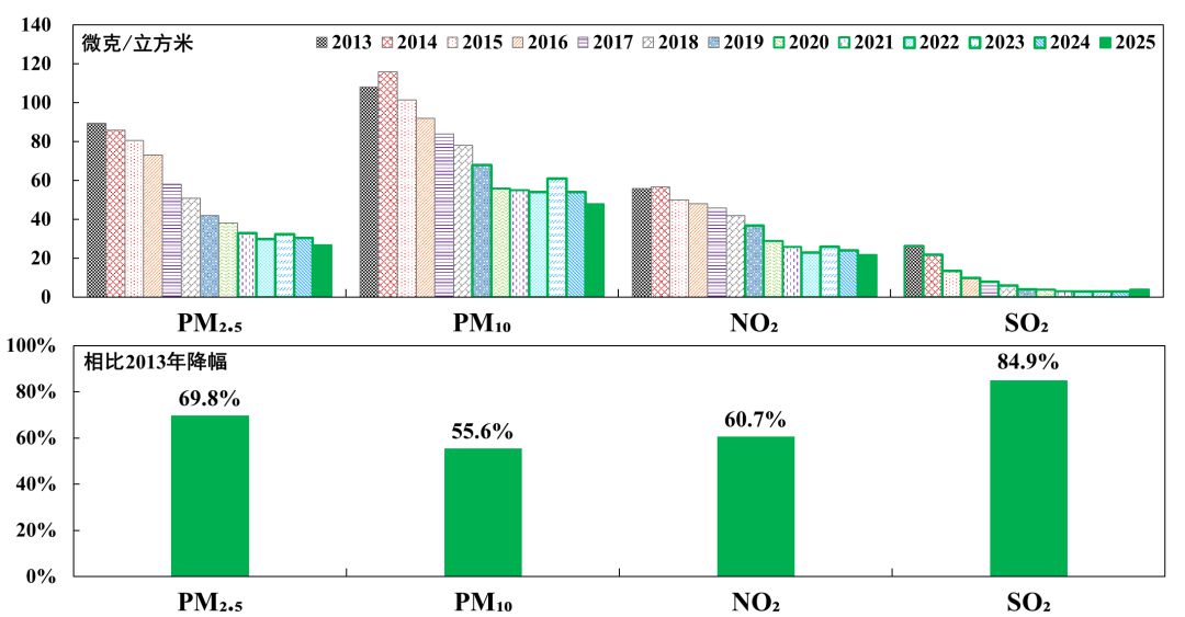 2013-2025年北京市主要污染物浓度及降幅
