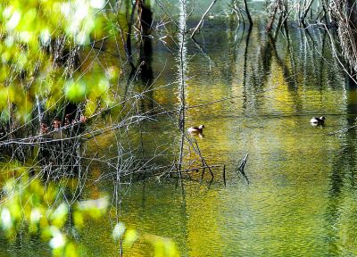 雁翅镇深山峡谷中,永定河补水后树木被河水淹没,成为水鸟繁育后代的乐园。