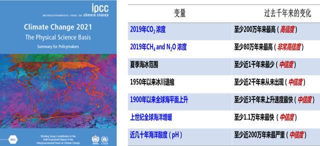 2021年8月,联合国政府间气候变化专门委员会(IPCC)发布了第六次评估报告第一工作组报告《气候变化2021:自然科学基础》。报告指出,科学家们一直在观测全球各个区域和整个气候系统的变化,观测到的许多变化为几千年来甚至几十万年来前所未有,一些如海平面持续上升等已经开始的变化在数百到数千年内不可逆转。报告强调,2011—2020年的十年间,全球地表温度比1850—1900年间高1.09℃,这是自12.5万年前冰河时代以来从未见过的水平,过去五年也是自1850年有记录以来最热的五年。全球升温可能在未来20年达到或超过1.5℃临界值;气候变化正在给不同地区带来多种不同的变化,这些变化都将随着全球变暖的进一步加剧而加剧;如果现在采取积极行动,气候变化的许多最可怕的影响仍然可以避免。
