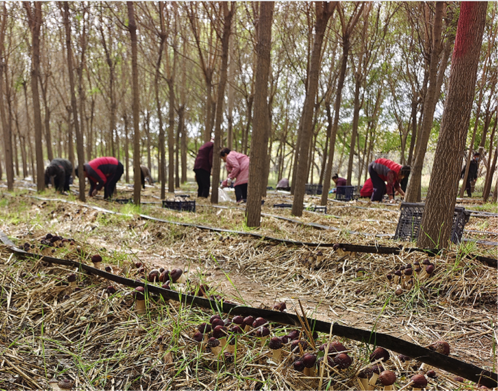 近年来,河北省晋州市大力发展林下经济,丰富林间景致,增加群众收入,实现林下生金、绿富双赢的规划目标。晋州市丰业合作社利用现有林地,将废弃梨树枝条加工成培养基,利用林下环境培植出赤松茸等食用菌,深受消费者青睐,探索出了一条林间变宝藏、垃圾变资源、农闲变农忙的群众增收致富新路径。图为群众在林间采集食用菌场景。