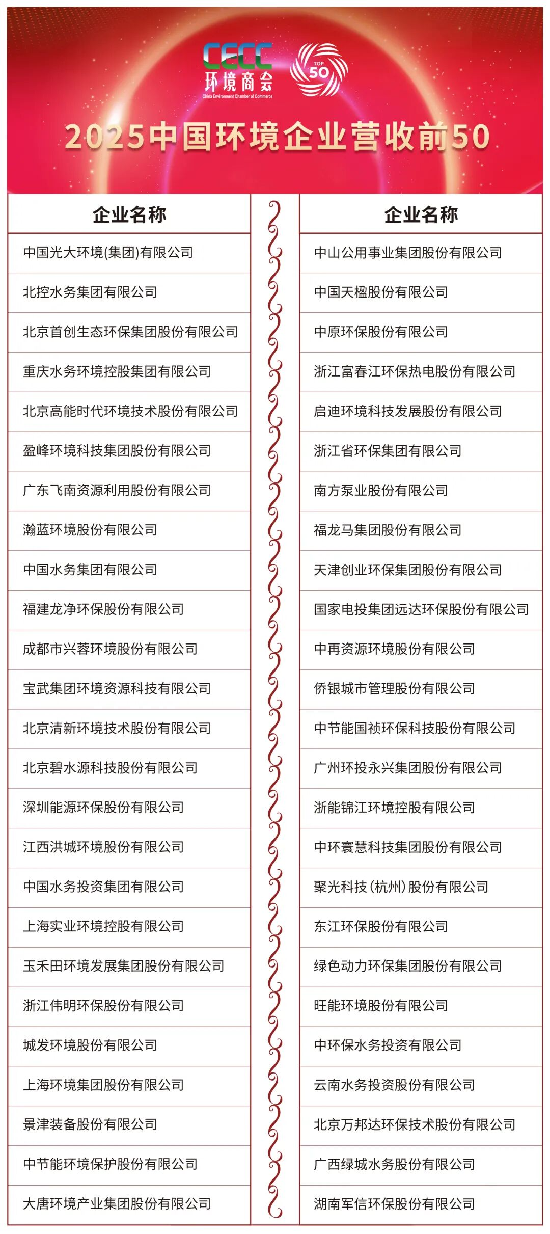 “2025中国环保企业营收前50”结合上规模环保企业调研,按照2024年度营业收入总额降序排列产生。其中,以环境为主营业务的上市公司按已公布的2024年报营收数据为准;环境类非上市公司以专业第三方机构提供的环境业务营收数据证明为准。同时,如某公司营收数据已计入母公司参评的,则此公司不再参评,以避免出现重复计数的情况。