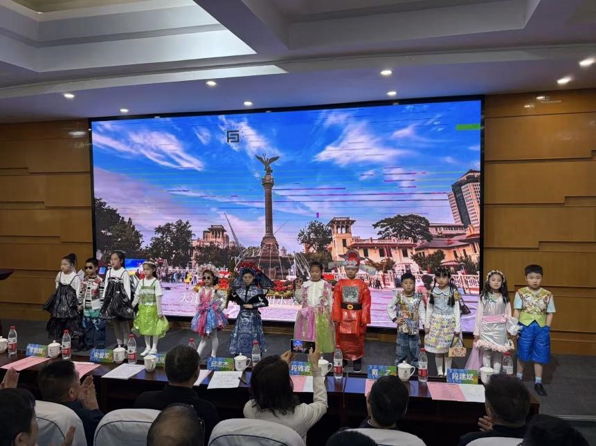 在随后的展示环节,河北区光明小学的学生带来了一场环保创意服装展示。孩子们身穿利用废弃纸张、塑料布等材料制作的服装依次登台,造型各异的“时装”引发在场观众的阵阵掌声。