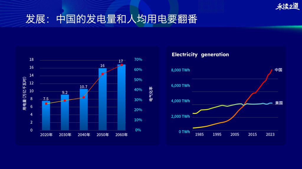 从2000年到现在,中国的用电量和能源结构发生了翻天覆地的变化。根据马斯克的数据,2024年,美国约有4亿人口,人均用电量1万多千瓦时,总量约4万亿千瓦时;而中国目前用电总量已达到10万亿千瓦时,是美国的两倍多。相关数据显示,从2000年到现在,中国的电力消耗已经翻了两番以上。未来,为了支撑经济增长和新能源发展,预计总发电量还要继续翻番,达到17万亿甚至更高。