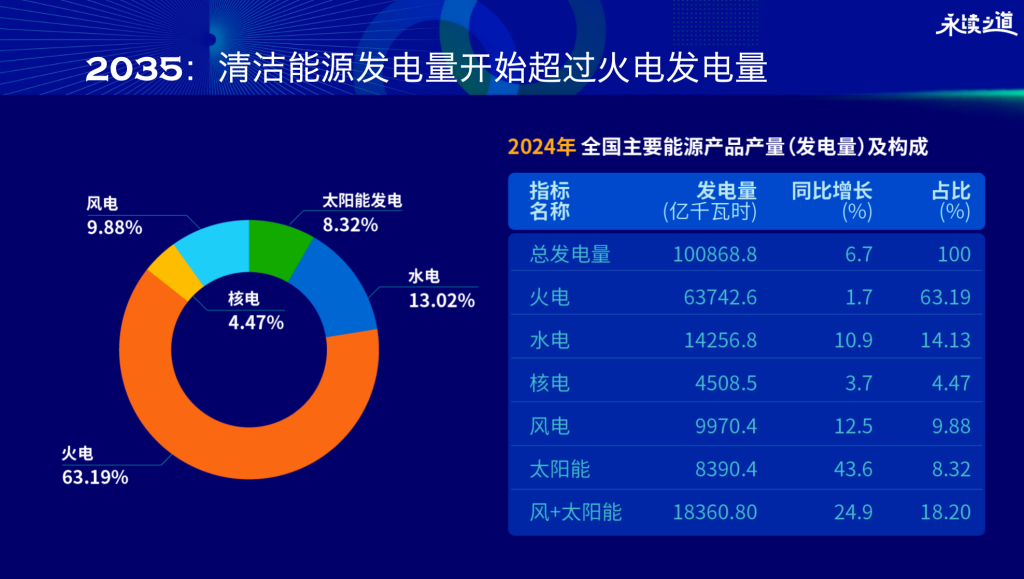 目前,中国新型电力系统建设已完成约30%。从数据看,2020年中国电力装机仍以火电为主,新能源(含水电、核电)占比不足50%。到2025年,火电占比降至43.14%,新能源占比首次突破50%,成为装机主力。根据规划,到2035年,清洁能源发电量将超过火电,煤电将由主导型能源转变为保障型能源。