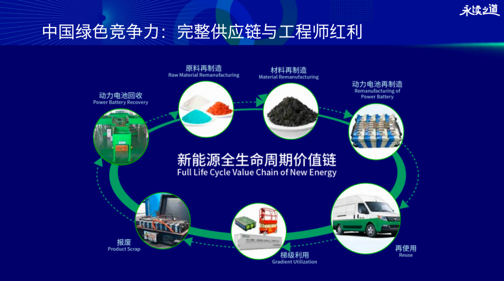中国的绿色发展,也是对整个价值链的系统性重构。以新能源汽车产业为例,动力电池是产业链的核心环节。目前全球十大动力电池企业中,中国占六家,并在技术和产能上处于领先地位。这种优势源于完整的上下游体系。上游掌握镍、钴、锂等关键原材料;中游具备高效制造和技术创新能力;下游通过回收体系实现循环利用,构建了闭环的绿色供应链。“正因为这种全产业链的布局,中国在全球新能源供应体系中具有不可替代的地位。”诸大建表示。