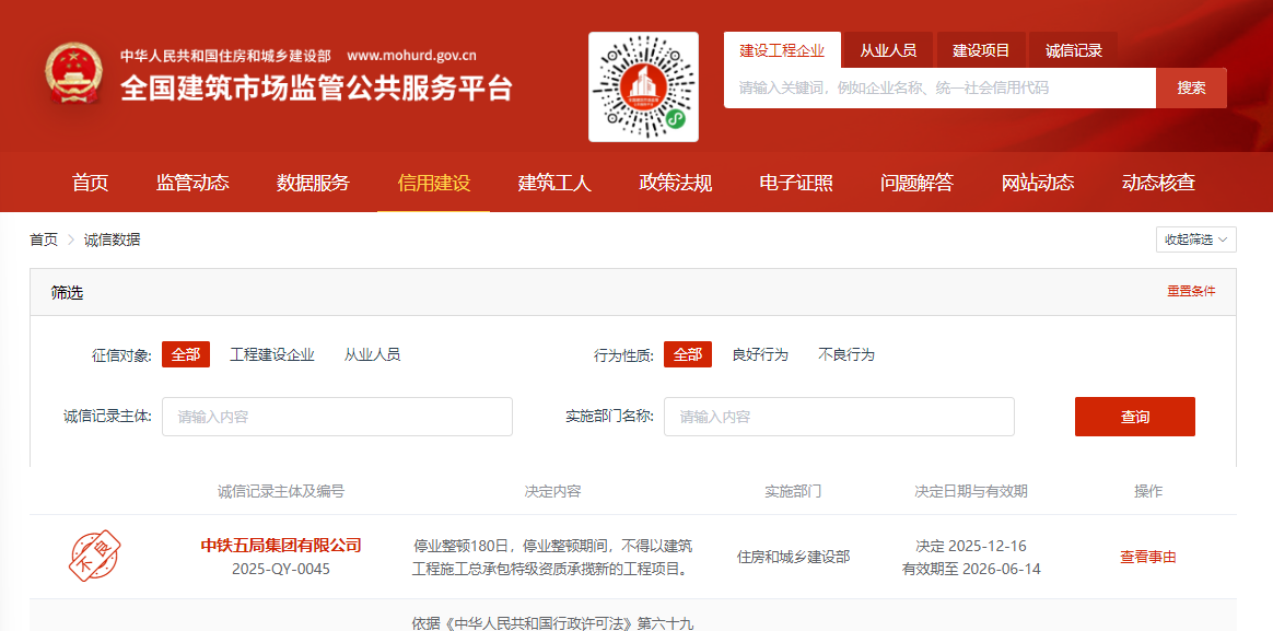 记者日前从全国建筑市场监管公共服务平台官网了解到,中铁五局集团有限公司(以下简称“中铁五局”)被住房和城乡建设部实施停业整顿180日,决定时间为2025年12月16日,有效期至2026年6月14日。停业整顿期间,不得以建筑工程施工总承包特级资质承揽新的工程项目,而涉及的具体事由未公开。