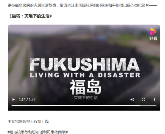 国际环保组织绿色和平拍摄出品的微纪录片——《福岛:灾难下的生活》。截图来自网络。