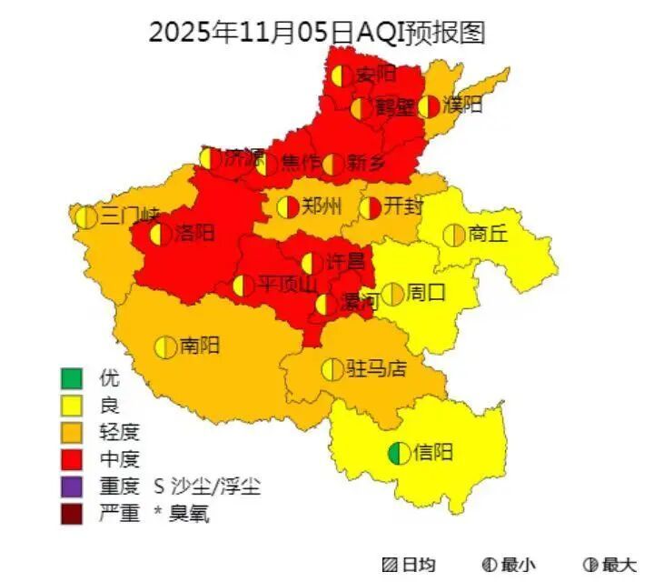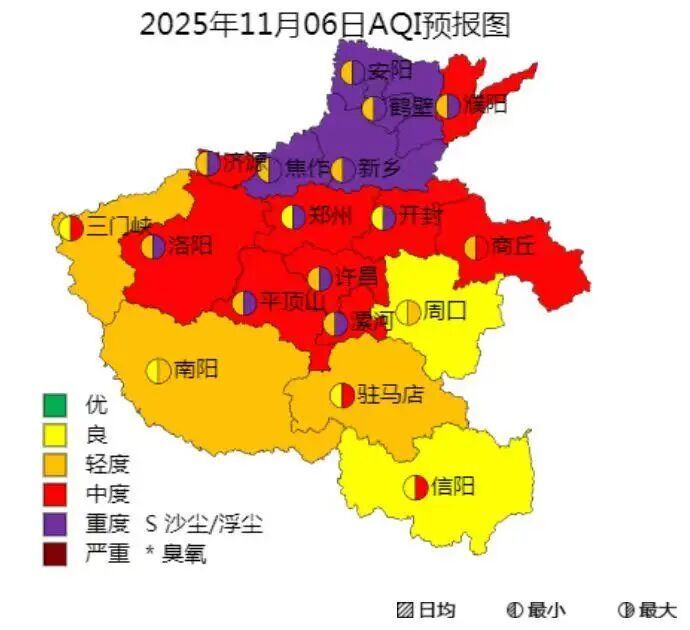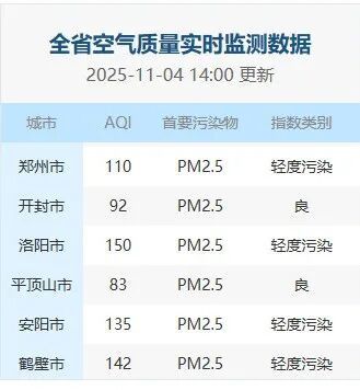 据河南省区域环境空气质量预报显示,11月4日至5日,东南风,污染逐渐积累,河南中北部及西部地区有中度污染过程;6日至8日,河南阴天有降水,但降水不确定性较大,偏北风为主,自北向南有中度污染过程,北中部、东部、西部可能出现重度污染时段;9日至11日,全省大部分地区可能仍有轻度或中度污染风险。