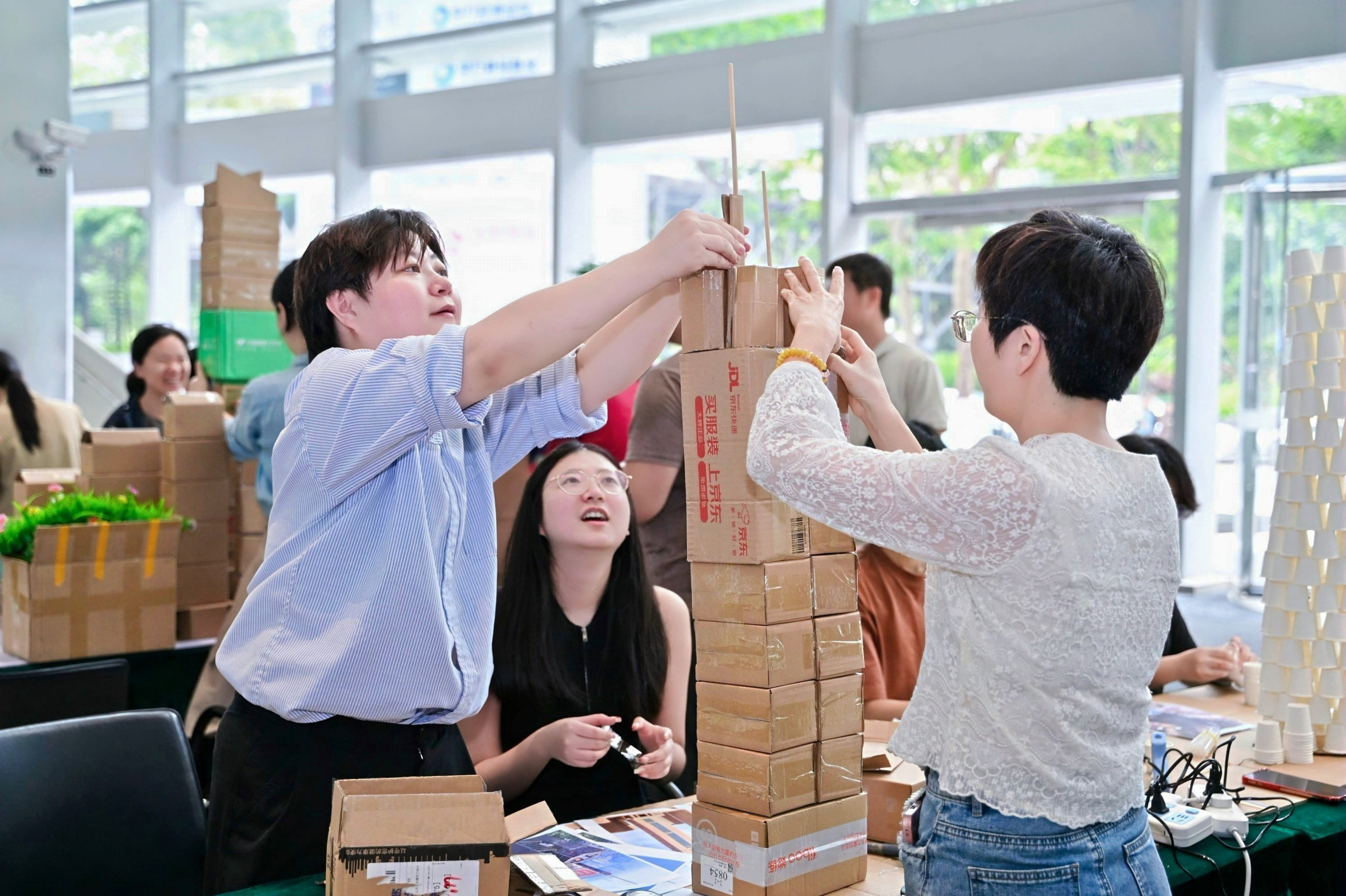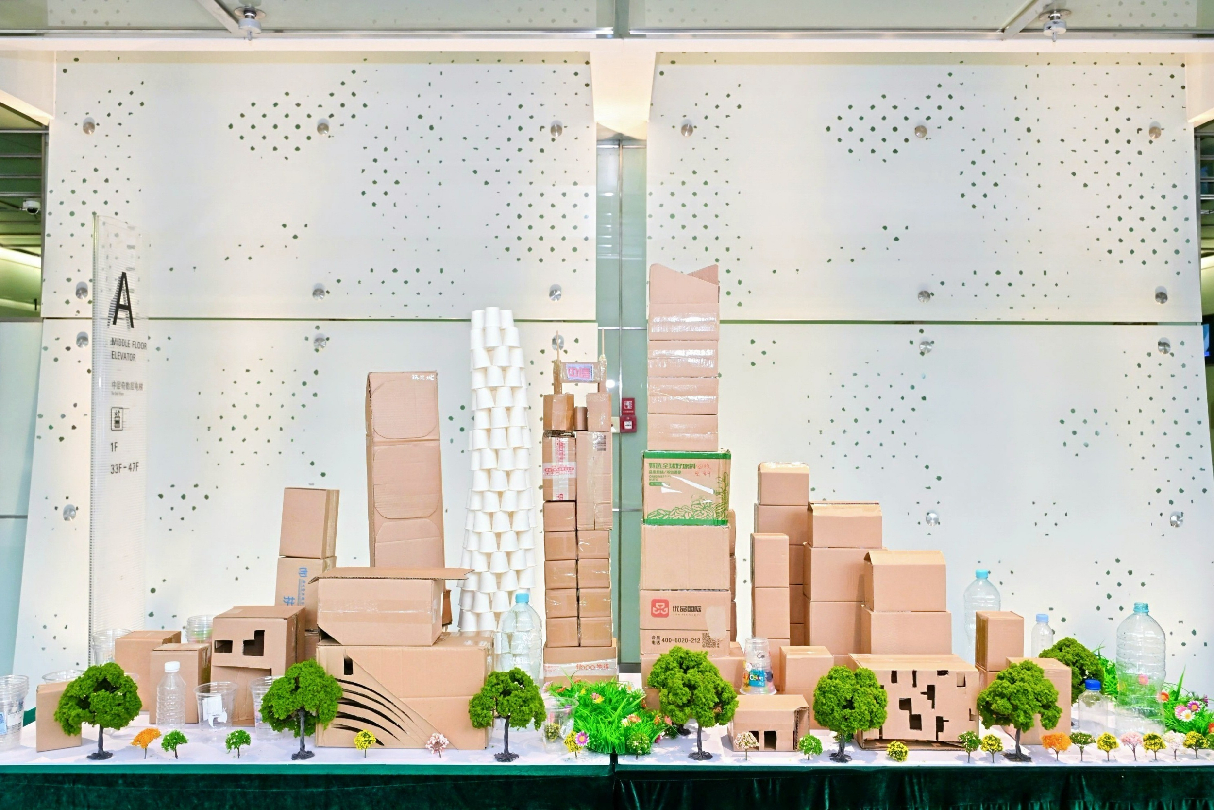 活动吸引了来自珠江城及周边商务楼宇的白领志愿者参与。午休时间,这些原本分散在各个办公室的上班族走出工位,共同投入到一场将废弃物转化为公共艺术的绿色实践。在指导老师讲解“无废”理念和创作思路后,志愿者们分组展开模块化共创,利用塑料瓶、纸箱等回收材料,分别制作东西塔、中信大厦等地标建筑模型及绿植生态单元。随着制作推进,一幅以天河CBD为蓝本的立体“城市画卷”在现场逐渐成形。作品通过材料的错位堆叠,巧妙勾勒出美丽天河的城区轮廓,并点缀绿色元素,生动诠释了城市发展与环境保护的有机融合。