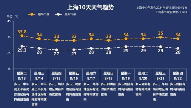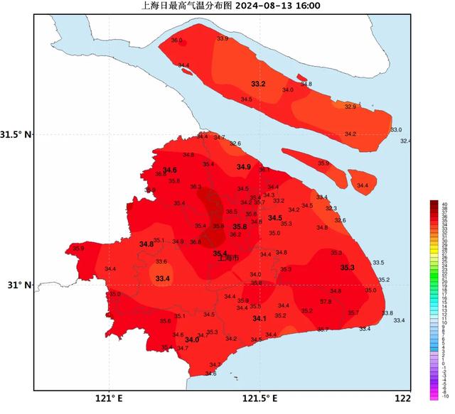 今天又是一个高温日最高气温达到高温线的站点是市区徐家汇站(35.8℃)和闵行站(35.4℃)其他站点普遍是在33-34℃附近由于空气湿度大体感闷热不舒适。