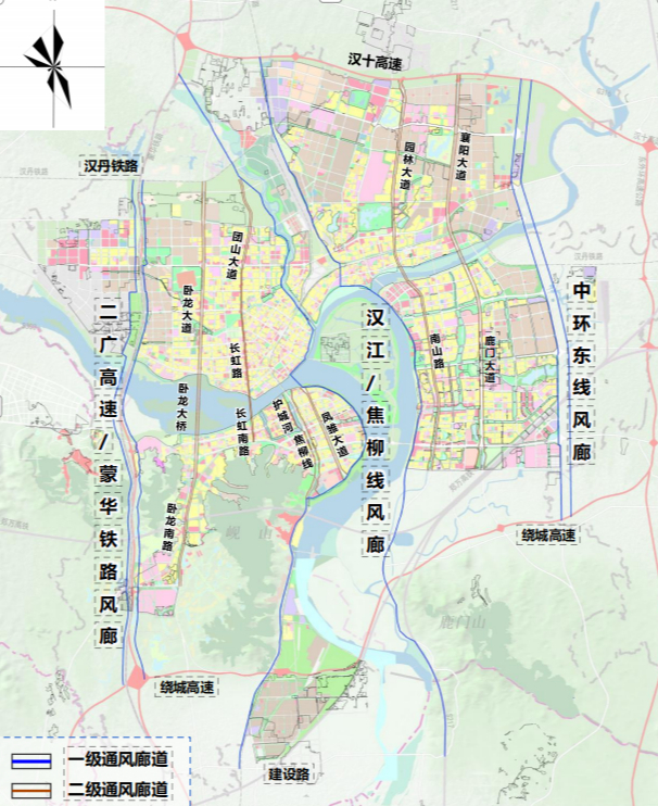 记者了解到,襄阳综合划定的中心城区一级通风廊道有3条、二级通风廊道共6条。一级通风廊道聚焦缓解中心城区空气污染,其中,汉江—焦柳线风廊宽度达3000米,二广高速/蒙华铁路和中环东线风廊宽度约500米。3条廊道利用贯穿全域的江河、铁路线,对城市通风环境起决定性改善作用。二级通风廊道侧重缓解城市热岛效应,包括卧龙大道—卧龙南路风廊(120米)、团山大道—长虹路风廊(50米)等,主要是与全年盛行风平行或呈较小夹角的主干道,深入城市内部打通“毛细血管”。