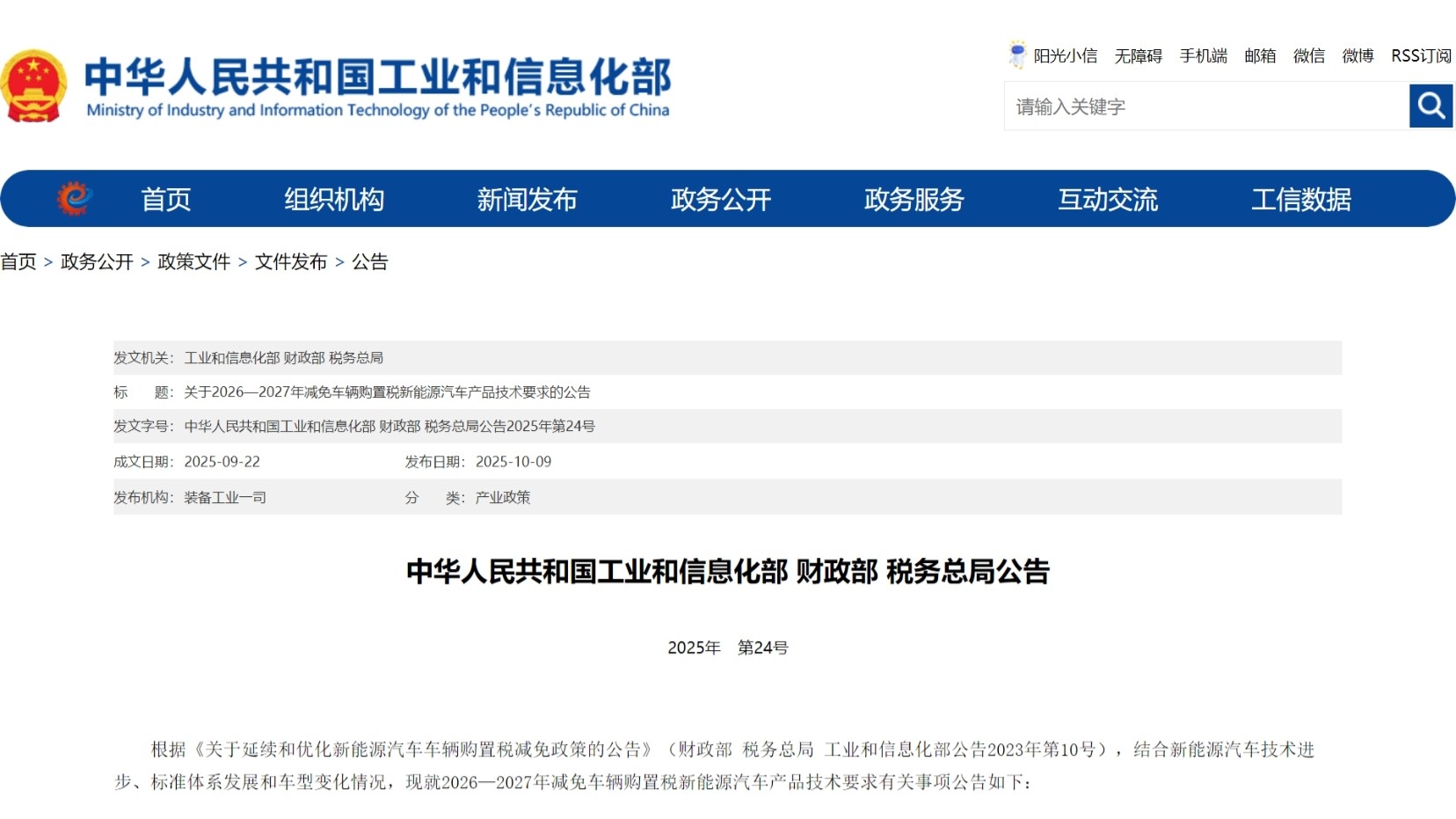 “不达标无免税!新能源车市将迎加速洗牌与结构优化。”多位业内人士向记者表示,工业和信息化部、财政部、税务总局三部门日前联合发布的《关于 2026-2027 年减免车辆购置税新能源汽车产品技术要求的公告》(以下简称《公告》),标志着已连续实施十年的新能源汽车全额免征购置税政策,将在明年进入新阶段,切换为 "减半征收+技术择优" 的新阶段。
